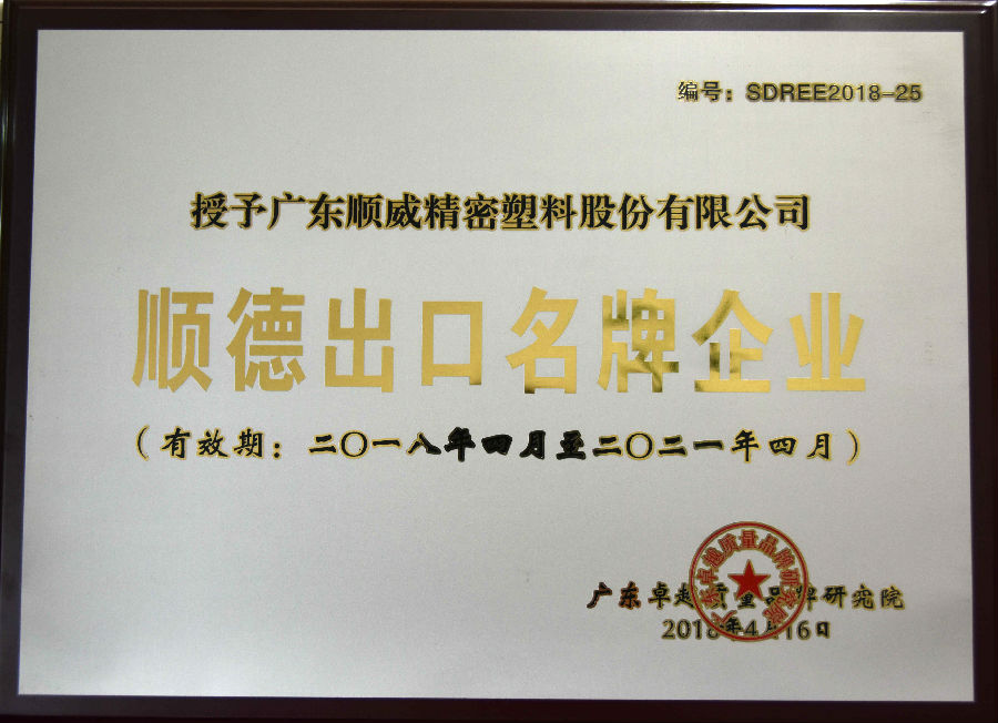 為推進順德出口名牌建設(shè),鼓勵先進,致力打造貿(mào)易強區(qū),6月26日,順德區(qū)經(jīng)科局攜手廣東卓越質(zhì)量品牌研究院聯(lián)合舉辦2018年度順德出口名牌企業(yè)頒牌儀式和經(jīng)驗分享。并同步進行“順德優(yōu)品紐約展示中心”展品征集,“品質(zhì)粵商”順德區(qū)域啟動儀式,以及第124屆廣交會品牌評審工作情況、一般性展位安排業(yè)務(wù)宣講。順威股份作為空調(diào)風(fēng)葉行業(yè)知名企業(yè),是順德區(qū)重點出口企業(yè),被評為了“2018年度順德出口名牌企業(yè)”。集團戰(zhàn)略及商務(wù)中心副經(jīng)理吳思銘出席了儀式并接受現(xiàn)場頒牌。