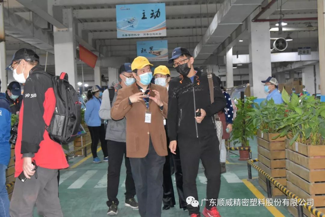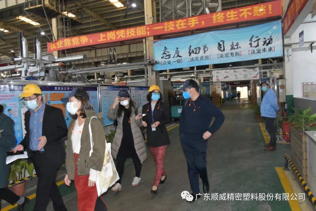 順威股份董事/總裁莫綺顏、董事/副總裁成再育、董事/副總裁/董事會秘書李笛鳴、工會主席/審計部總監童貴云、順德塑料分公司總經理范瑞強、順德模具分公司總經理龐利彬、集團戰略及商務中心/集團人力行政中心總監羅華、國內營銷中心總監助理/大客戶部高級經理王曉菲,一眾公司高管團隊在廠區廣場迎接中外媒體參觀團一行的到來。